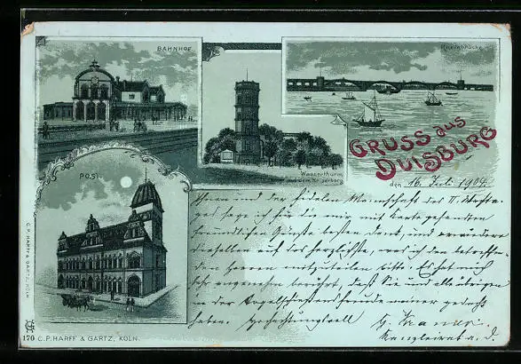 Mondschein-Lithographie Duisburg, Bahnhof, Rheinbrücke, Post
