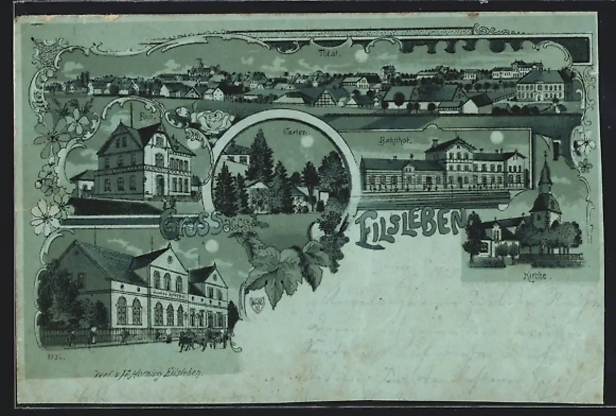 Mondschein-Lithographie Eilsleben, Bahnhof, Post, Gasthof Gustav Knüppel, Kirche