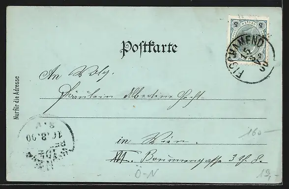 Personenbezogene Daten auf der Rückseite der Karte wurden durch blauen Textmarker unkenntlich gemacht. Die blauen Stellen sind auf die Vorderseite durchgeweicht und wirken sich negativ auf das Postkartenfoto aus