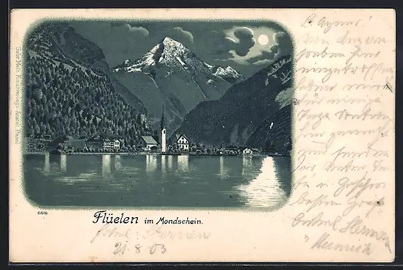Mondschein-Lithographie Flüelen, Blick zur Kirche
