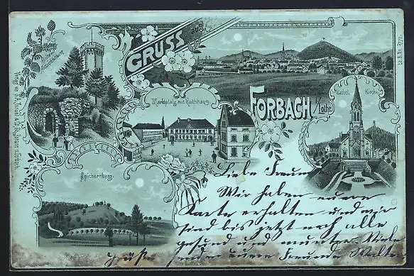 Mondschein-Lithographie Forbach i. Lothr., Marktplatz mit Rathaus, Spichernberg, Kathol. Kirche