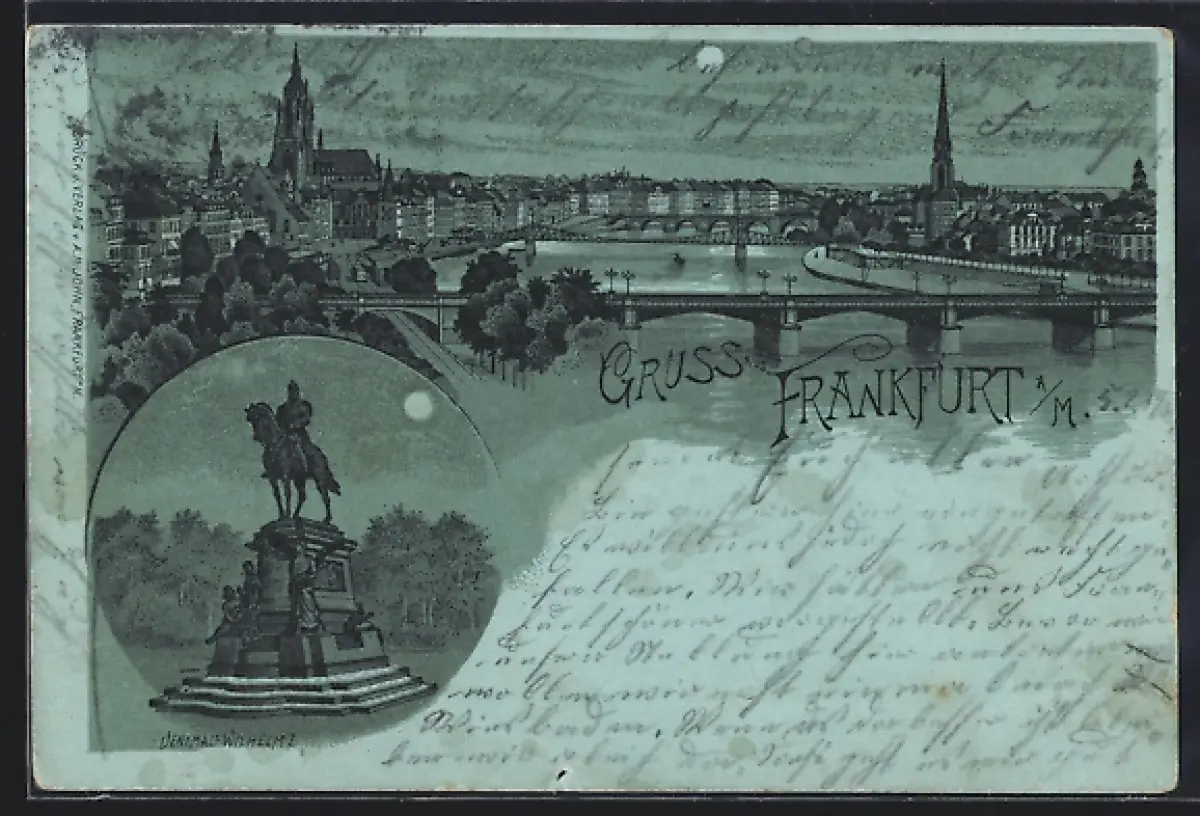 Mondschein-Lithographie Frankfurt a. M., Mainbrücke, Dom, Denkmal Kaiser Wilhelm I.