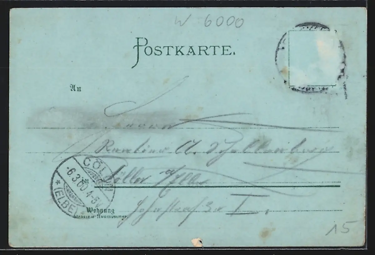 Personenbezogene Daten auf der Rückseite der Karte wurden durch blauen Textmarker unkenntlich gemacht. Die blauen Stellen sind auf die Vorderseite durchgeweicht und wirken sich negativ auf das Postkartenfoto aus