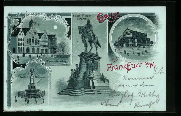 Mondschein-Lithographie Frankfurt a. M., Opernhaus, Römer und Römerberg, Stoltze-Denkmal