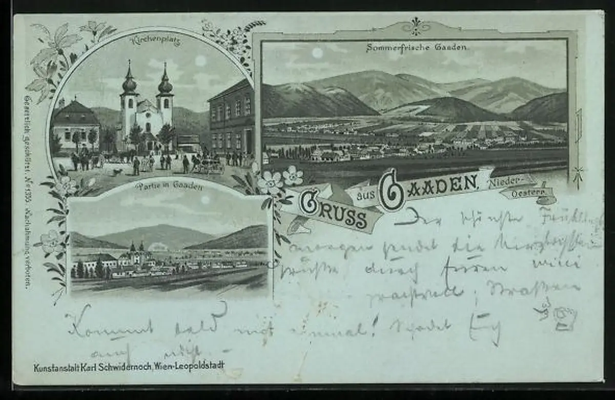 Mondschein-Lithographie Gaaden /Nieder-Oesterr., Kirchenplatz, Ortsansicht aus der Vogelschau