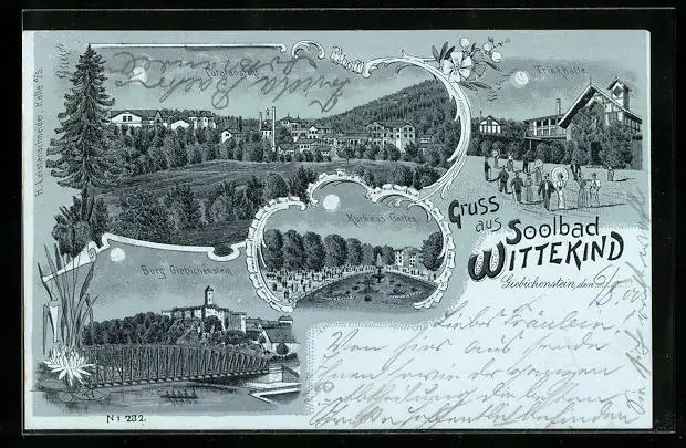 Mondschein-Lithographie Giebichenstein, Totalansicht mit Trinkhalle, Soolbad Wittekind, Kurhaus, Burg