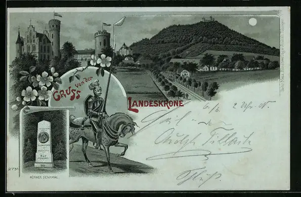 Mondschein-Lithographie Görlitz, Gasthaus Landeskrone mit Burgansicht und Körner Denkmal