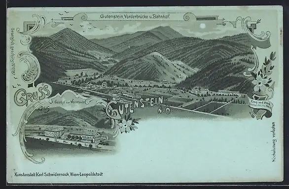 Mondschein-Lithographie Gutenstein /N.-Ö., Gasthof zur Weintraube, Totalansicht mit Bahnhof