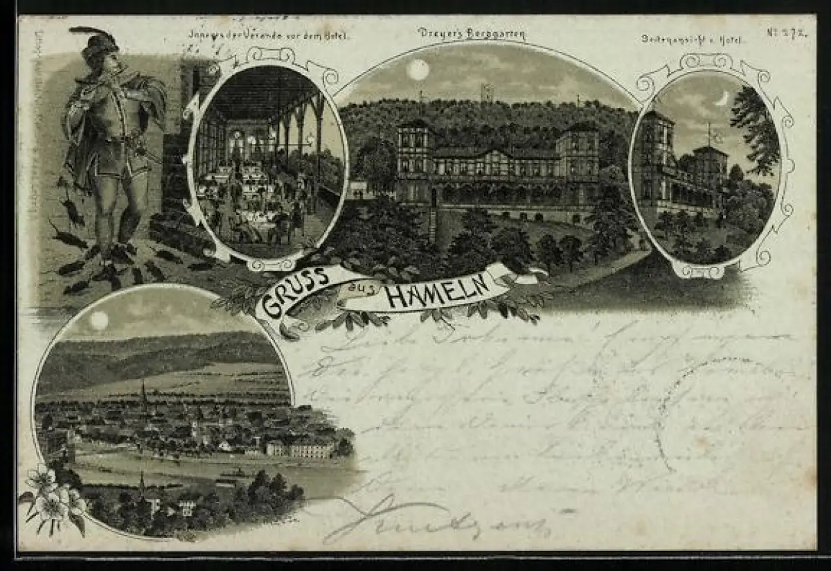 Mondschein-Lithographie Hameln, Dreyer`s Berggarten, Inneres der Veranda vor dem Hotel, Gesamtansicht