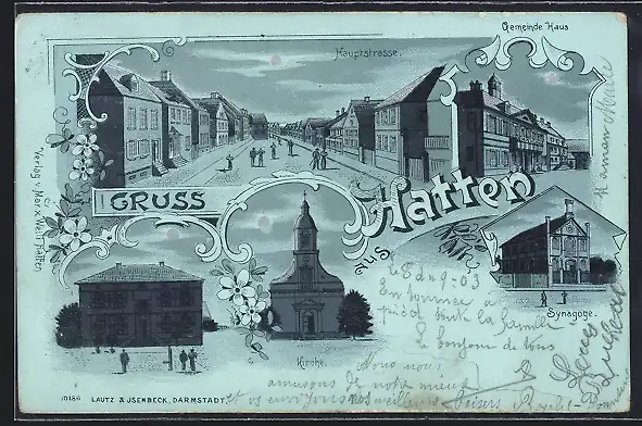 Mondschein-Lithographie Hatten, Synagoge, Hauptstrasse, Kirche und Gemeindehaus