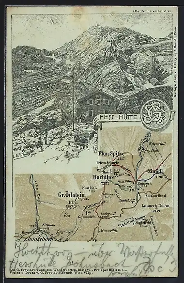 Mondschein-Lithographie Hess-Hütte, Landkarte der Region um Gr. Ödstein, Hochthor und Plan-Spitze