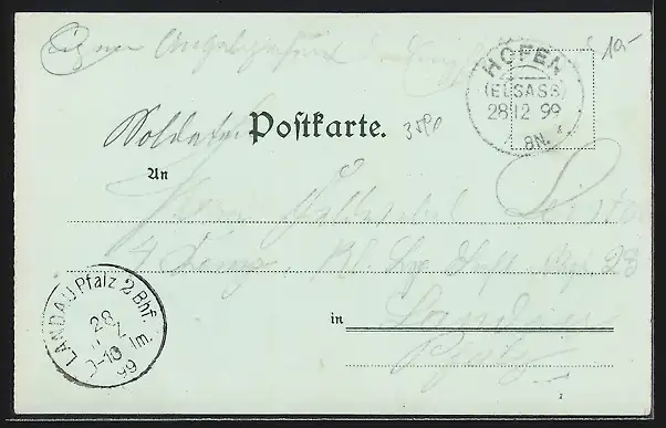 Personenbezogene Daten auf der Rückseite der Karte wurden durch blauen Textmarker unkenntlich gemacht. Die blauen Stellen sind auf die Vorderseite durchgeweicht und wirken sich negativ auf das Postkartenfoto aus