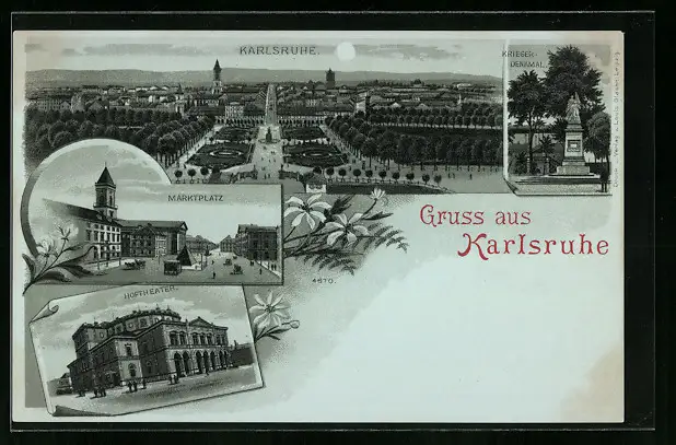 Mondschein-Lithographie Karlsruhe, Gesamtansicht aus der Vogelschau, Krieger-Denkmal, Marktplatz, Hoftheater