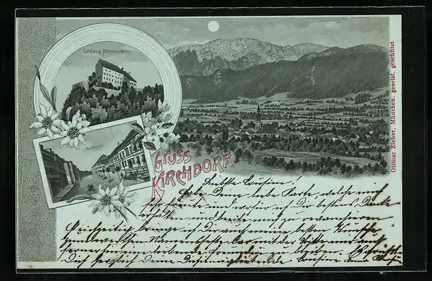 Mondschein-Lithographie Kirchdorf /O.Ö., Schloss Altpernstein, Marktplatz, Ortsansicht