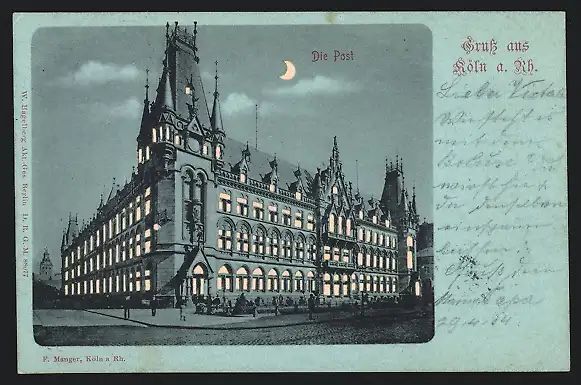 Mondschein-Lithographie Köln a. Rh., Die Post mit leuchtenden Fenstern, Halt gegen das Licht