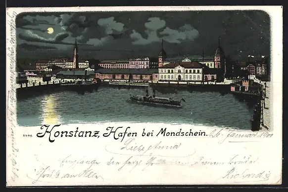 Mondschein-Lithographie Konstanz, Hafen mit Strassenblick aus der Vogelschau, Dampfer