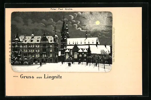 Mondschein-Lithographie Liegnitz, Peter-Paul Kirche im Winter