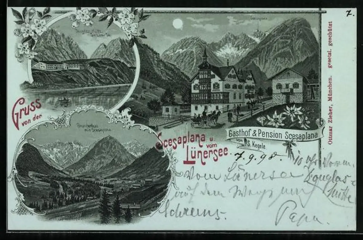 Mondschein-Lithographie Lünersee, Gasthof und Pension Scesaplana, Bes. S. Kegele, Douglass-Hütte