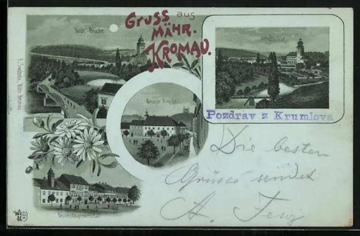 Mondschein-Lithographie Mähr. Kromau, Neue Brücke, Grosser Ringplatz, Bezirkshauptmannschaft