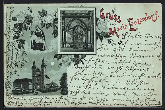 Mondschein-Lithographie Maria Lanzendorf, Kirche, Innen- und Aussenansicht