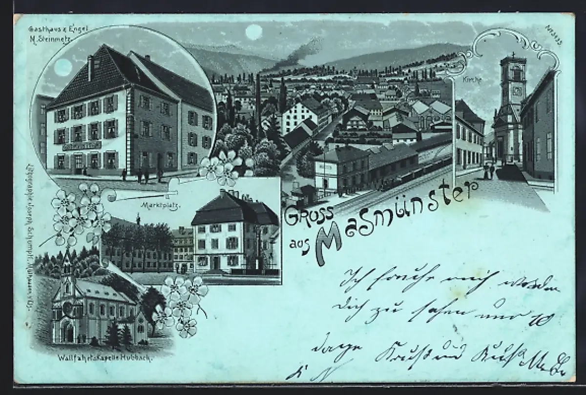 Mondschein-Lithographie Masmünster, Gasthaus z. Engel, Marktplatz, Kirche