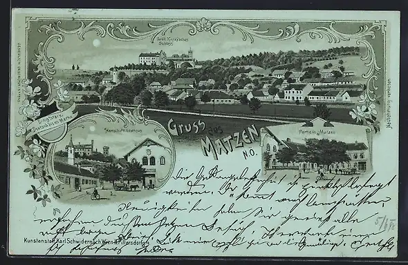 Mondschein-Lithographie Matzen /N. Ö., Herrschaftl. Gasthaus, Ortsansicht mit Gräfl. Kinsky`schem Schloss