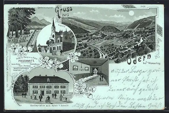 Mondschein-Lithographie Odern bei Wesserling, Restaurant zum Adler, Bes. F. Schmitt, Kapelle und Totalansicht
