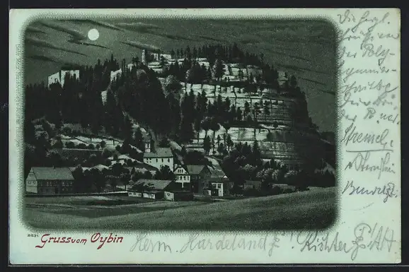 Mondschein-Lithographie Oybin, Ortsansicht aus der Vogelschau