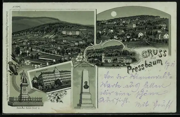 Mondschein-Lithographie Pressbaum, Norbertinum, Kirche und Schule