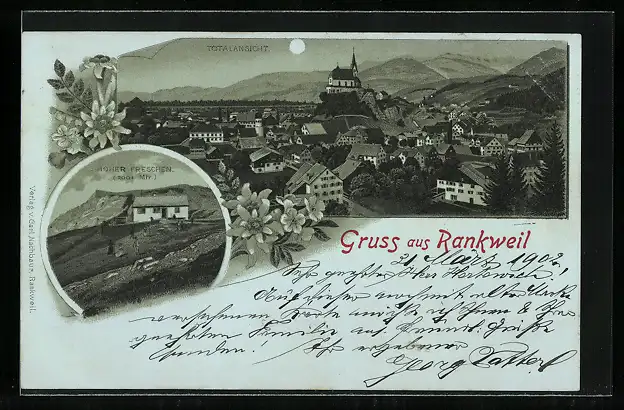 Mondschein-Lithographie Rankweil, Hoher Freschen und Totalansicht