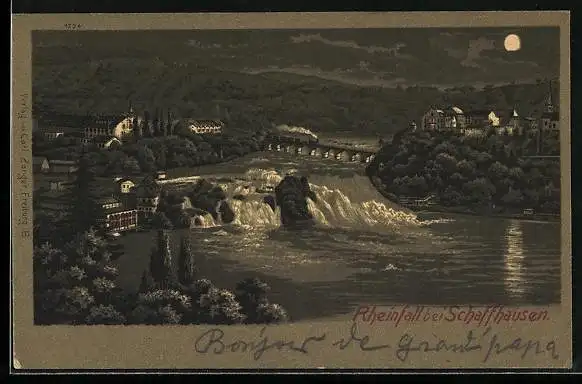 Mondschein-Lithographie Rheinfall, Panorama bei Nacht