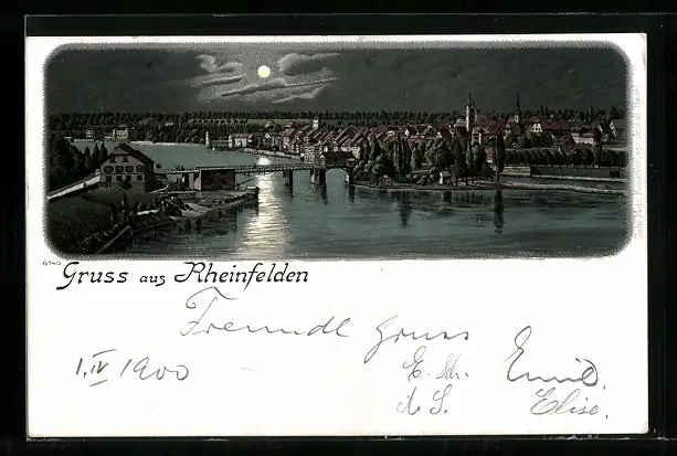 Mondschein-Lithographie Rheinfelden, Ortsansicht bei Nacht
