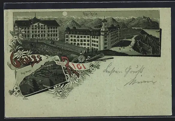 Mondschein-Lithographie Rigi, Rigi-Kulm mit Hotel und Rigi-Staffel