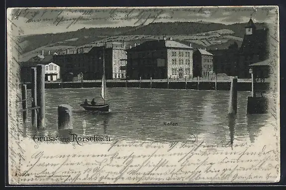 Mondschein-Lithographie Rorschach, Gebäude am Hafen