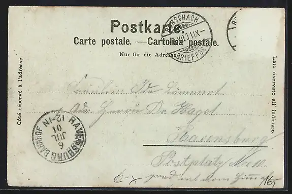 gelaufen 1901, Briefmarke entfernt, rückseitig Oberflächenschaden, Eckknicke li., Einriss re. oben