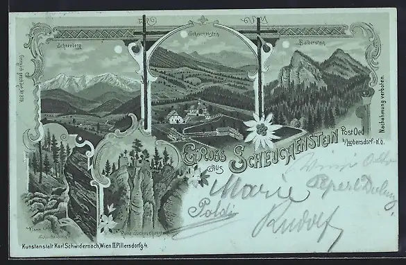 Mondschein-Lithographie Scheuchenstein /Leobersdorf, Klamm, Burgruine, Schneeberg, Balberstein
