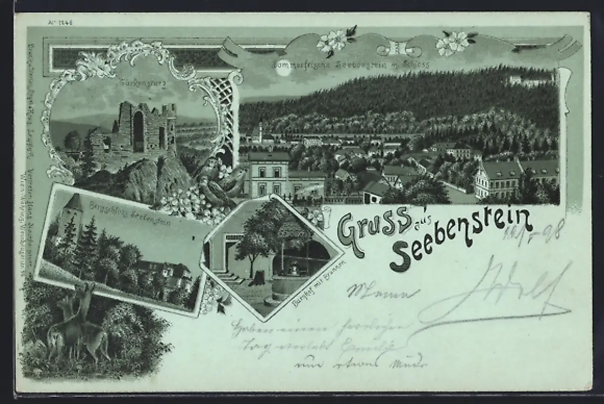 Mondschein-Lithographie Seebenstein, Türkensturz, Bergschloss Seebenstein, Burghof mit Brunnen, Ortsansicht