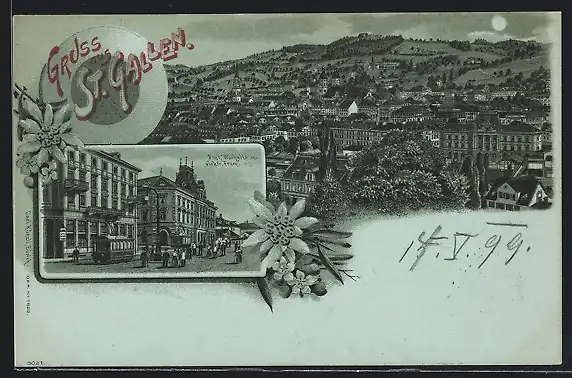 Mondschein-Lithographie St. Gallen, Walhalla mit elektr. Strassenbahn, Post, Ortsansicht
