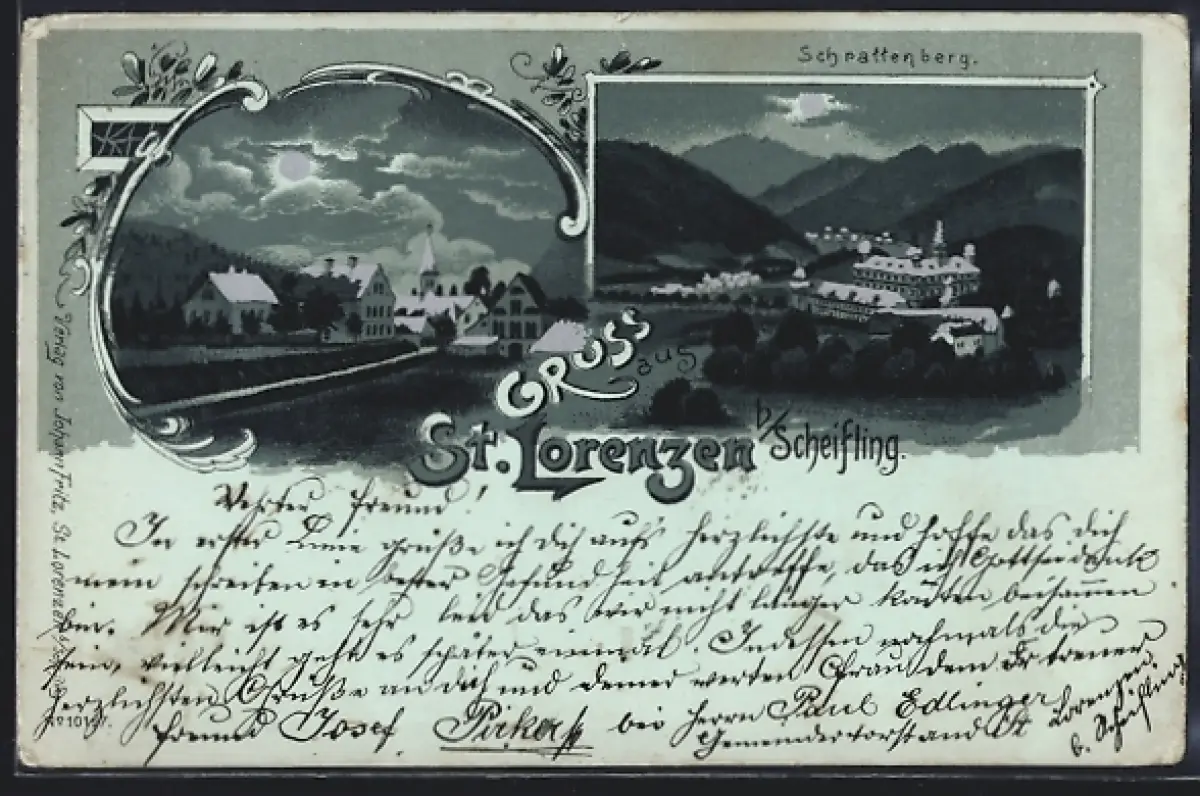 Mondschein-Lithographie St. Lorenzen b. Scheifling, Schrattenberg, Ortsansicht mit Landstrasse, silberner Mond