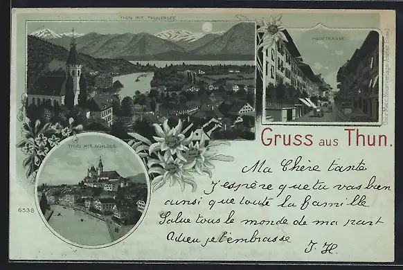 Mondschein-Lithographie Thun, Hauptgasse, Teilansicht mit Schloss, Bergpanorama