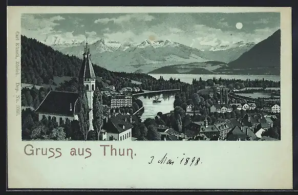Mondschein-Lithographie Thun, Ortsansicht mit Blick in die Berge