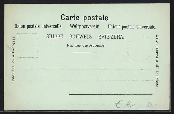 Personenbezogene Daten auf der Rückseite der Karte wurden durch blauen Textmarker unkenntlich gemacht. Die blauen Stellen sind auf die Vorderseite durchgeweicht und wirken sich negativ auf das Postkartenfoto aus