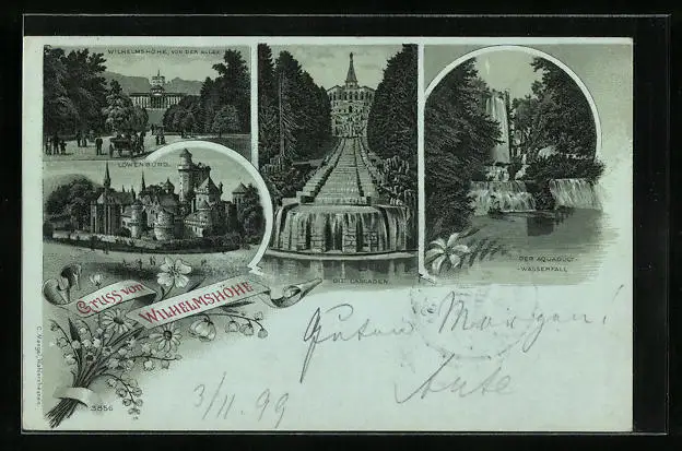 Mondschein-Lithographie Wilhelmshöhe, Löwenburg, Die Kaskaden, Wasseraquaduct-Wasserfall