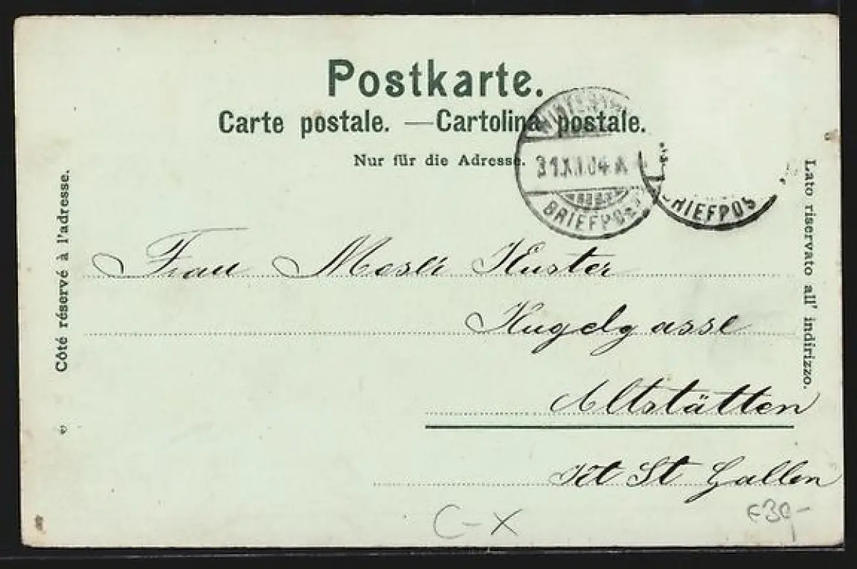 gelaufen 1904, Briefmarke entfernt, rückseitig Oberflächenschaden, Eckknick li. oben, guter Zustand