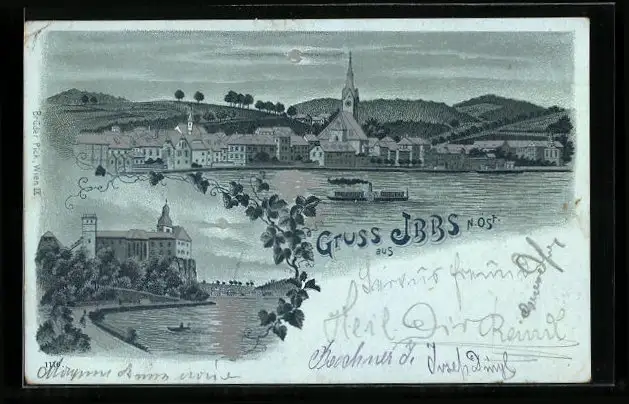Mondschein-Lithographie Ybbs, Ortsansicht, Dampferpartie
