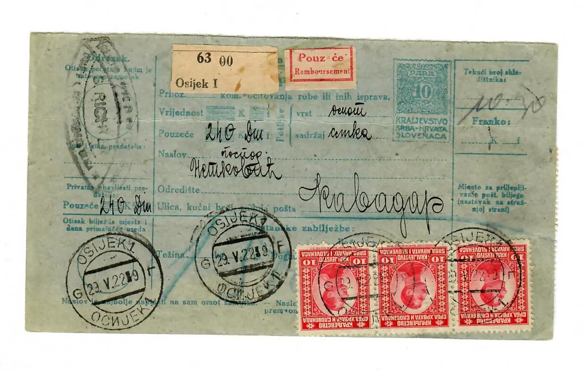 Money Transfer, Geldanweisung 1922, Osijek to Kabagap