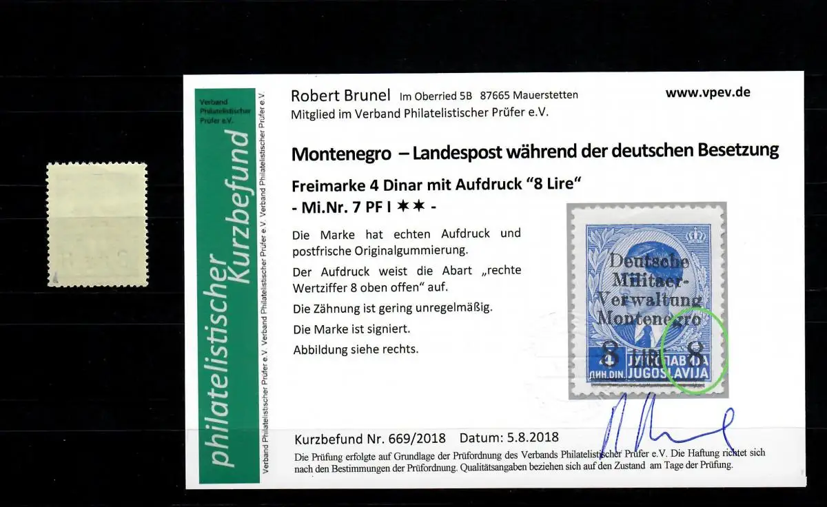 Montenegro: MiNr. 7, Plattenfehler I, postfrisch, **