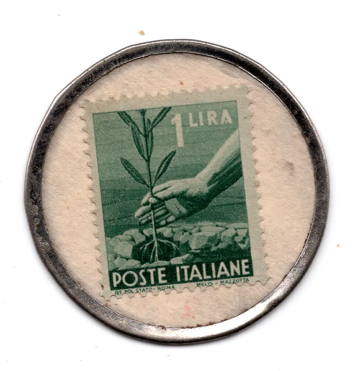 Motta (Karmin) Notwendigkeitsmarke - Motta (Karmin) - Pappständer mit Aluminiumrand und Werbedruck Caffè Perotti Mondovì in Karmin mit aufgesetzter 1-Lire-Briefmarke der Demokratischen - BBB-Qualität - Selten Cod. 222/16