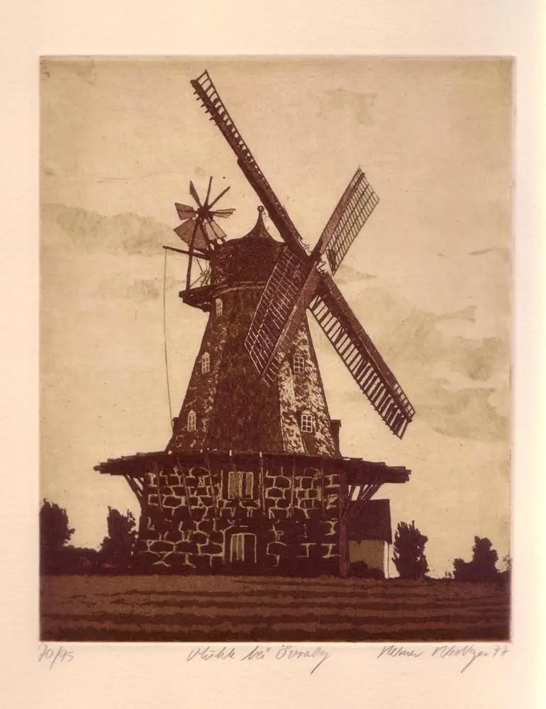 Nr. 70 von 95 Exemplaren. - Darstellung der 1887 erbauten, selbstdrehenden Windmühle in Schweden. Zu dem Maler u. Graphiker Reimer Riediger (1942-1991), dessen bevorzugte Technik die Farbradierung war, siehe Schleswig-Holsteinisches Künstlerlexikon (1984), 2, S. 145