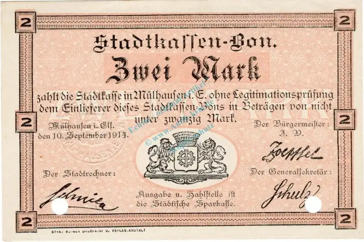 Mühlhausen , Notgeld 2 Mark Schein in unc-kfr.E Diessner 247.6 , Elsass 1914 Notgeld 1914-15